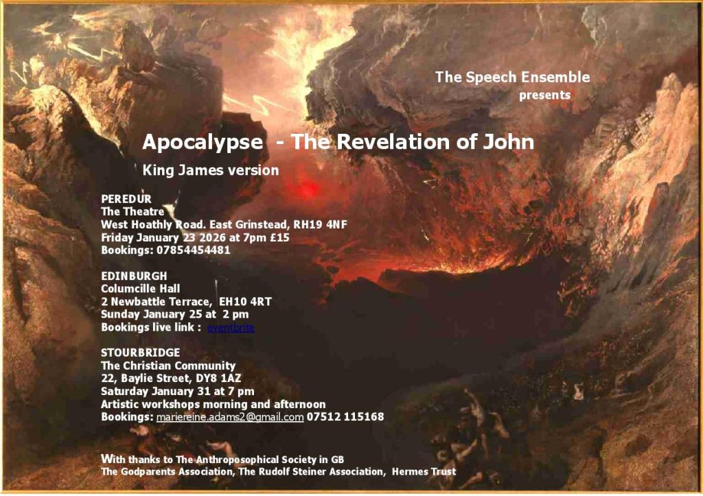 The awestruck silence which lasted for several minutes at the end of the performance of The Apocalypse in South Devon showed how much the members of the full audience had been uplifted. For some ninety minutes they had been immersed in a vibrant world of cosmic pictures from the book of the Revelation of St. John. Applause seemed too trivial a thing after such an unforgettable experience.